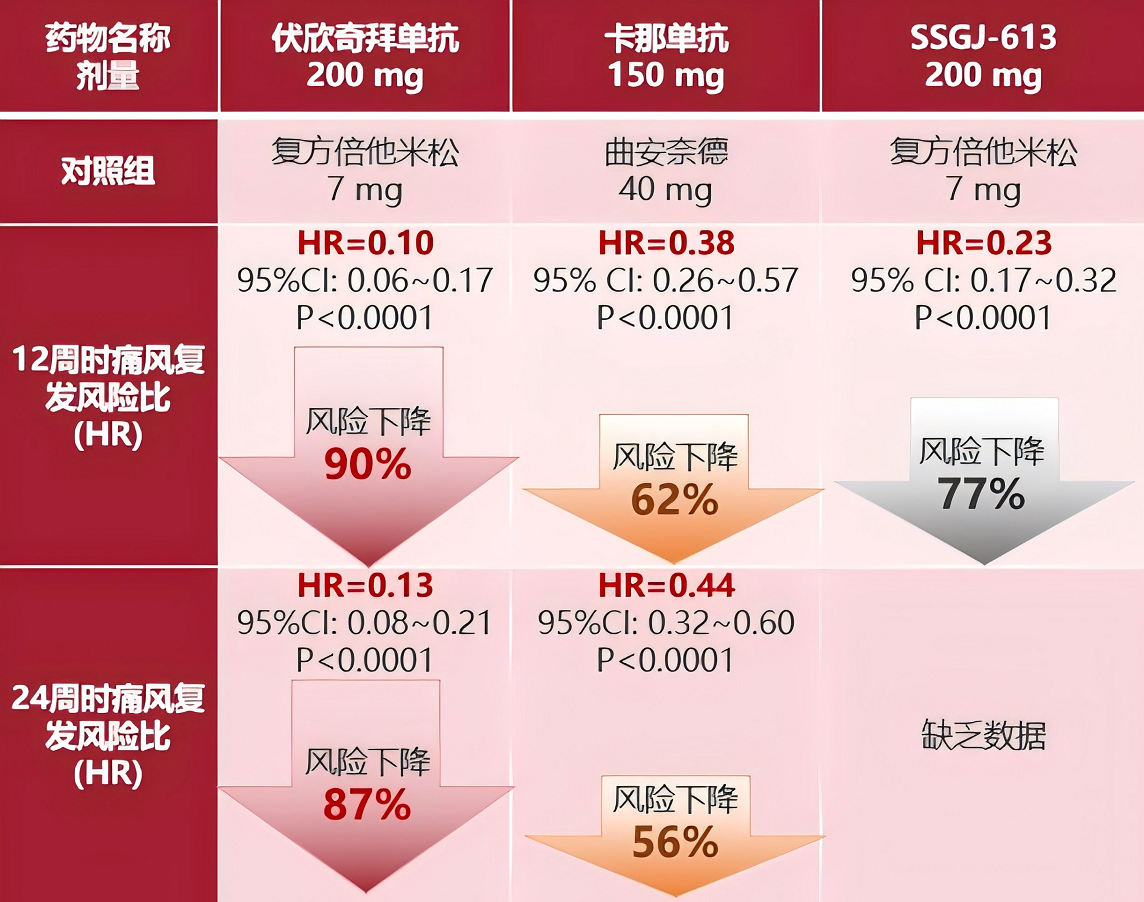 显耀缩短急性发作频率:基于伏欣奇拜单抗、卡那单抗的III期盘考和SSGJ-613的II期盘考数据,伏欣奇拜单抗在第12周初次出现新的痛风急性发作的发生率昭着更低[3-5, 7]。
