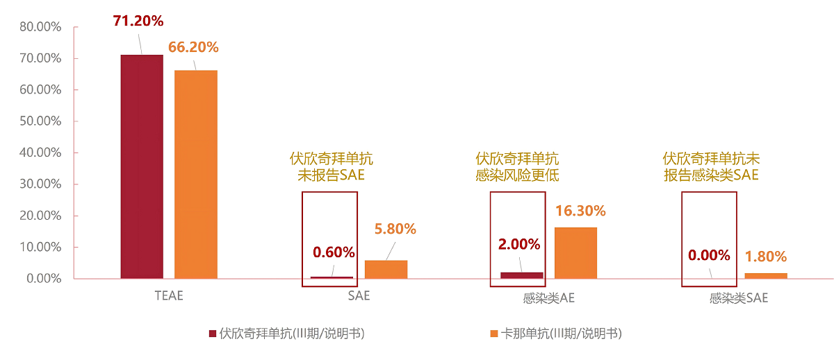 ○在严重不良事件(SAE)发生率方面,伏欣奇拜单抗较卡那单抗昭着更低。