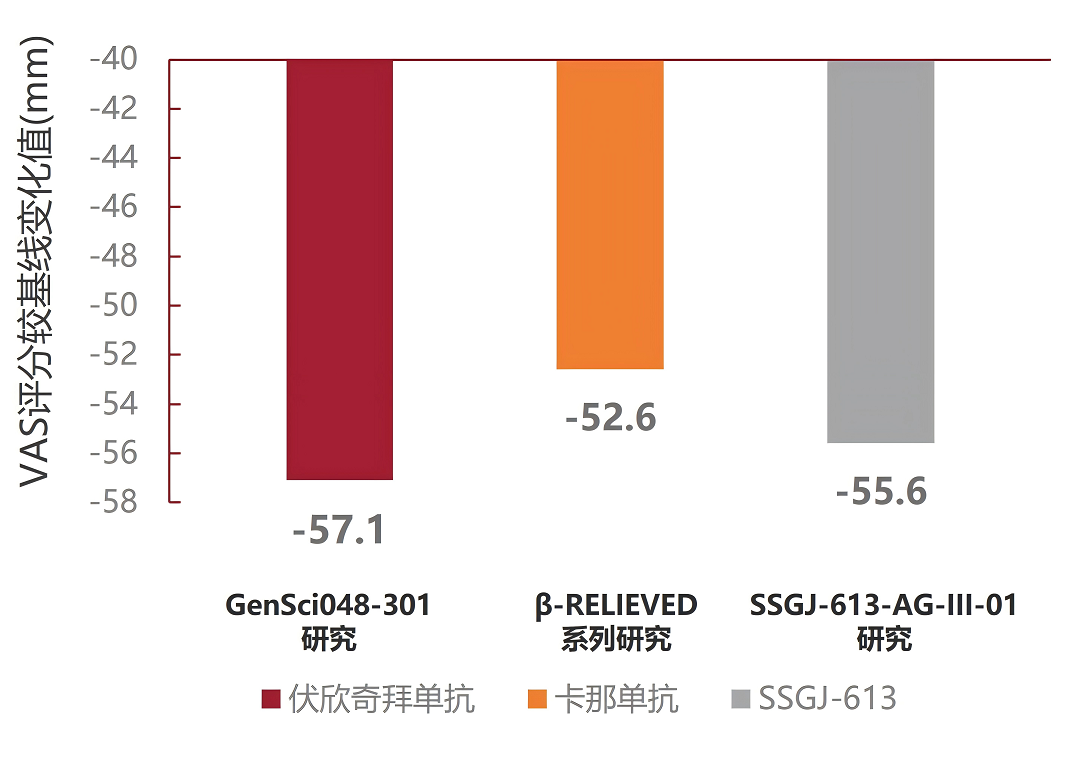 72小时快速镇痛,疗效确证:在缓解急性期痛苦方面,伏欣奇拜单抗72小时VAS痛苦评分改善幅度在几种IL-1β单抗中最大,展现出高大的镇痛才智[3-6]。