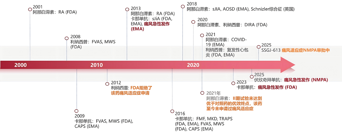 图1. 用于痛风急性发作的IL-1扼制剂的发展经由