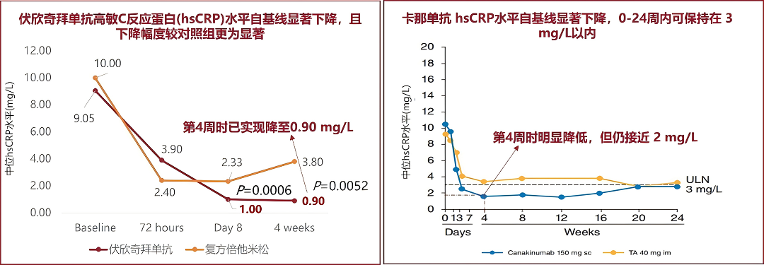 强效抗炎,让炎症目标“俯首”:C响应卵白(CRP)是体内炎症的“晴雨表”。伏欣奇拜单抗和卡那单抗均可显耀缩短CRP水平,但伏欣奇拜单抗发扬更优:调治4周后,使用伏欣奇拜单抗的患者高敏CRP(hsCRP)水平已降至0.90 mg/L,远低于同类药物约2 mg/L的水平,展现出更强的抗炎后果[3, 4]。