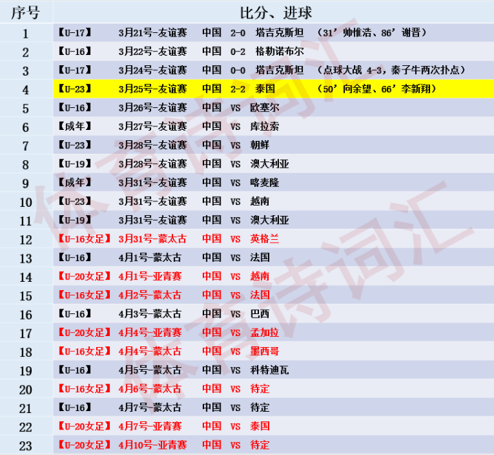 按照赛程,中国将在28号晚上濒临朝鲜,31号晚上迎战越南。中国U-23男足队内8名主力被国足征召,因此本次进行了威望更新,保留了亚洲杯的12东说念主,其中李昊等3个门将皆无缘,而是选拔了姚浩洋、刘骐伟、袁建锐、于金永四东说念主,毛伟杰、李新翔、汪士钦、廖荣祥、玄智健等东说念主再次入选,而张英凯、韦子弦两东说念主则是初度入选,另外补招了杜月徵。