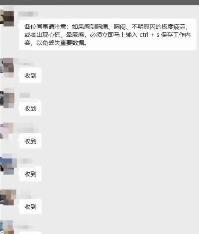 一张公司群聊天截图这两天传开了。实践不复杂:职工若是出现心梗前兆,先把未保存的文献科罚好。群里一行“收到”,比那句教唆自己更夺目。许多东说念主转发,不是以为豪恣,而是太老练了。