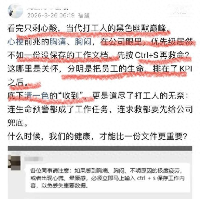 这件事之是以传播快,不在于措辞多重,而在于它把许多职场东说念主的实在处境压缩成了一句话:形体报警了,使命还得排在前边。胸痛、胸闷,本该是坐窝求援的信号,在一些办公室语境里,却先变成了“别逗留过程”。