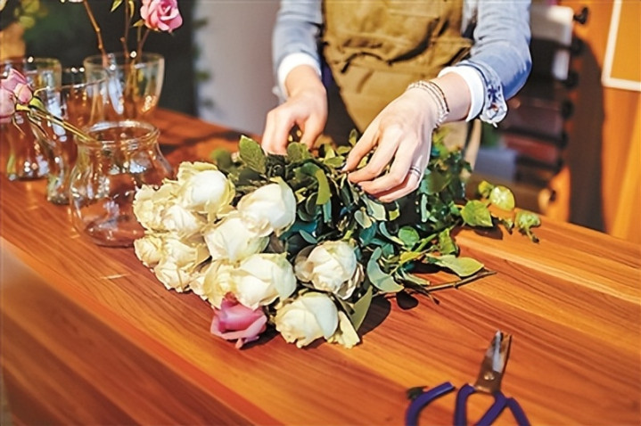 薛明施行里有知道员的倔强,创业就思作念到最佳,每天天不亮就去花市选花,躬行剪花、扎花束,坚合手不戴手套。