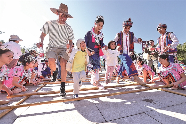 搭客在海南三亚南山文化旅游区跳竹竿舞。新华社发