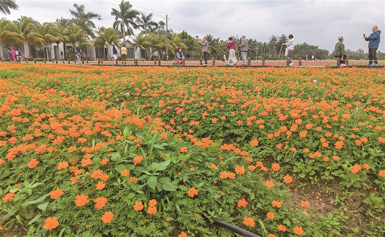 游东谈主在海南琼海正途坡村花海赏花。新华社发