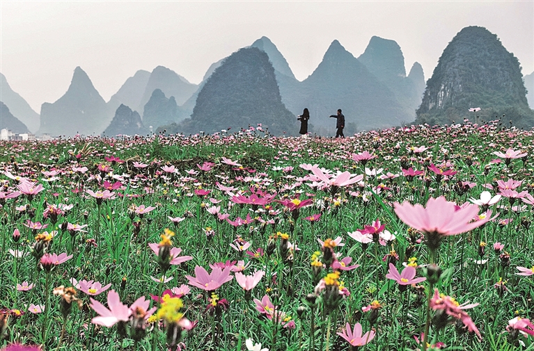 广西桂林,运用“冬闲田”熏陶的花草引诱搭客前来不雅赏。新华社发