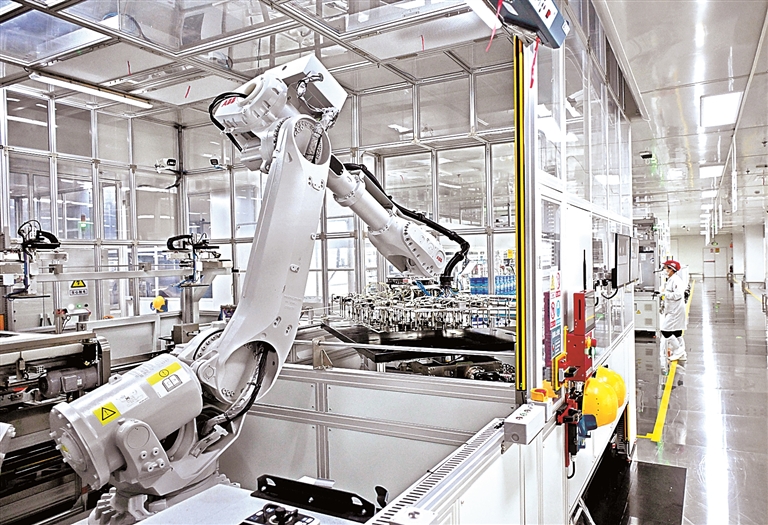 工业机器东谈主在“灯塔工场”智能安装线上清贫。新华社发