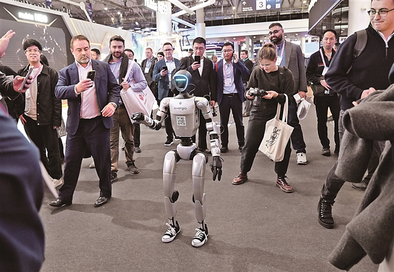 2026年世界挪动通讯大会上,东谈主们正在围不雅行走的东谈主形机器东谈主。新华社发