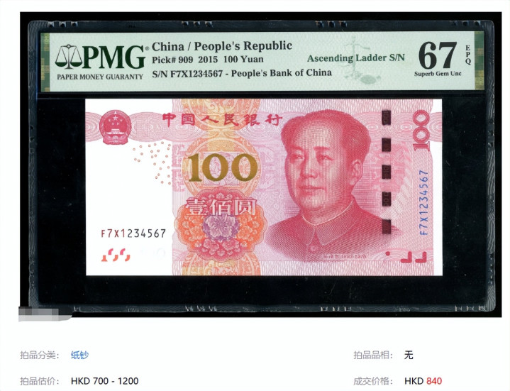再看另外一张2015年的100元纸币,相通是67分的评级币,这张纸币的价钱就会相比低了,它的拍卖价钱是840港币。