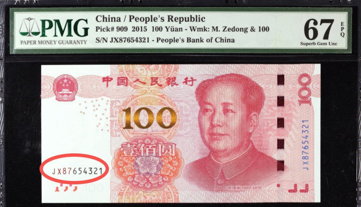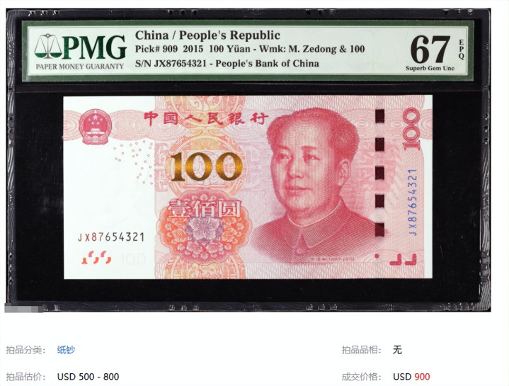 咱们临了再来看一张2015年的100元纸币。这张纸币的拍卖价钱是900好意思元,相称于东说念主民币6214元。这张纸币是一张倒顺子号纸币,况兼是倒八顺号,它的活水号是87654321,再加上67分的评级,让这张纸币拍出了6000多块钱的高价。