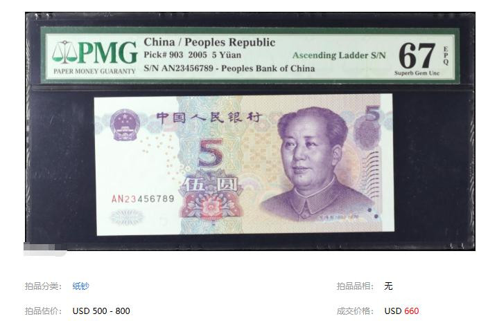 各人看,这是一张2005年的5元纸币。这张5元纸币是一张67分的评级币,它的拍卖价钱是660好意思元,折算成东说念主民币的话,大略是4,557元,能卖到这个价钱,开云体育官网最主要的原因就在于它的活水号上。它是一张23456789这么的天顺号纸币。像这么的纸币,一个冠号内部一般只会出现3张,是相比爱戴的版块。