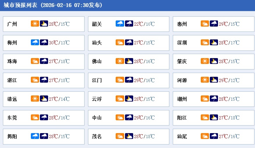 16日(除夜),粤北偏北市县和粤东沿海市县阴天间多云,有小雨,其余市县多云间阴天,局部有小雨;清晨西部市县和粤西海面局部有大雾。白日最高气温:大部市县26~30℃,韶关、清远18~23℃。